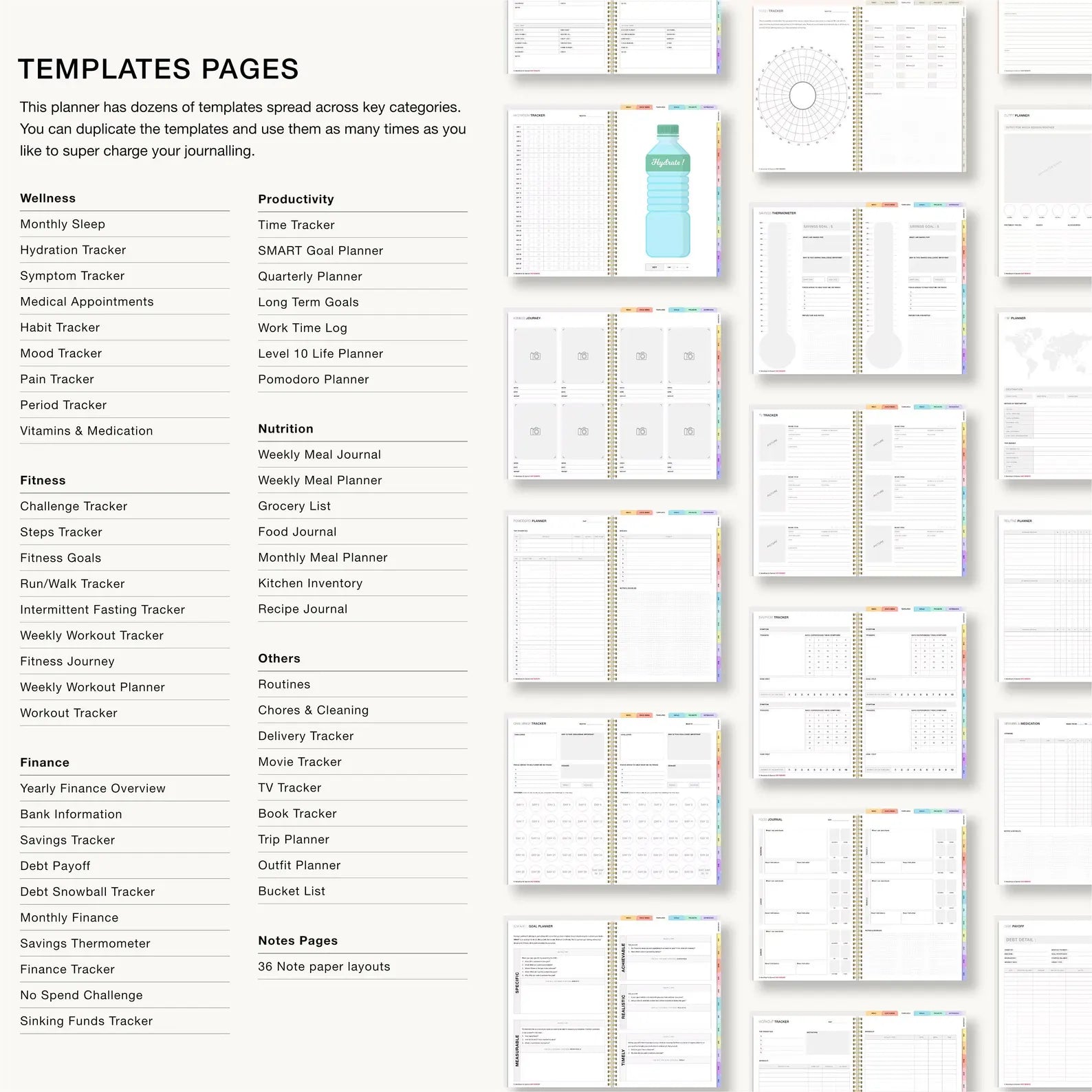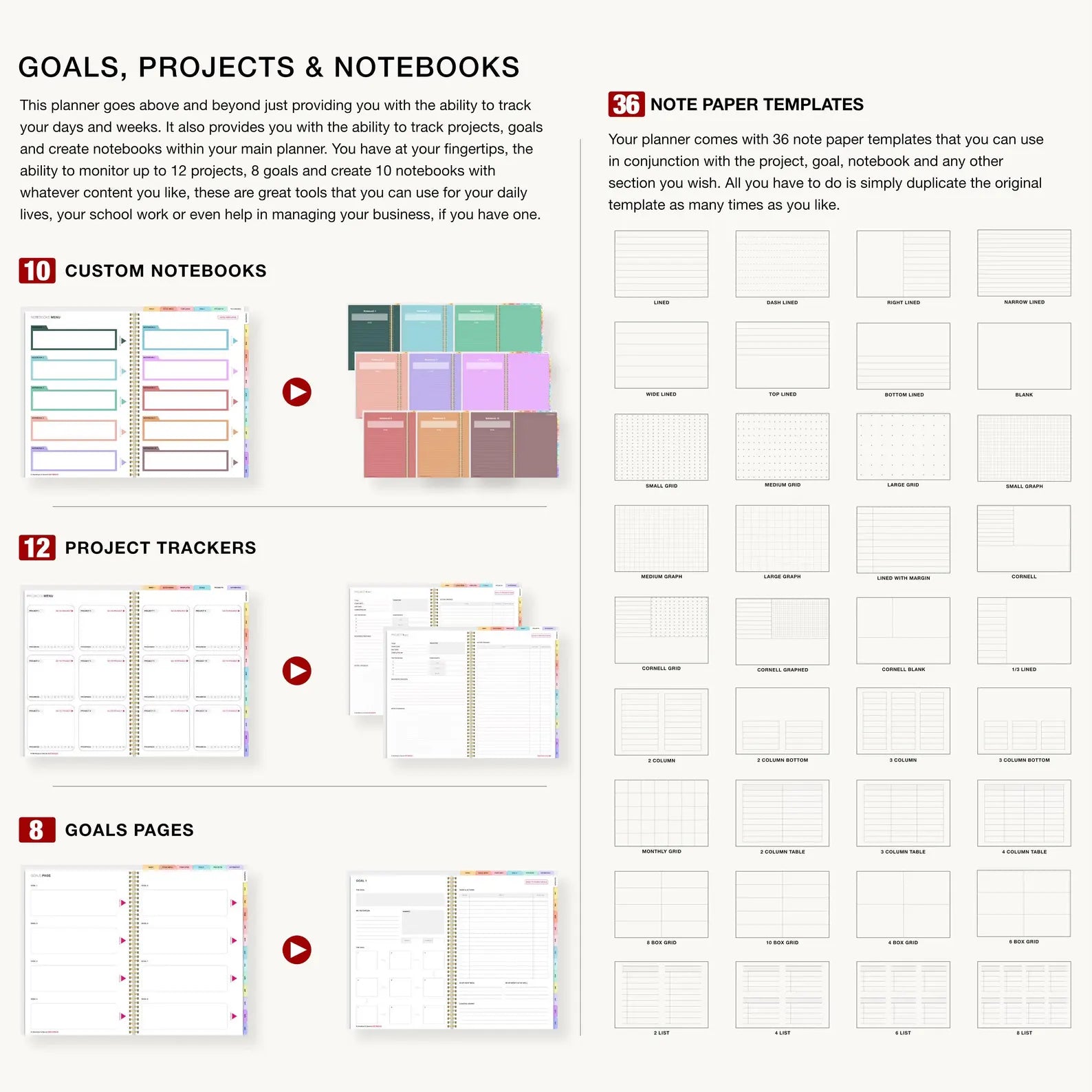 - 32 New Additional Planning Templates: Goal Plan, Project Plan, Meeting Notes, Event Plan, Task Delegation, Cleaning Plan, Meal Plan & Grocery List, Recipe, Reading List, Book Review, Watching List, Listing List, Travel Plan, Gift List, Contact List, Password Tracker, Saving Tracker, Expense & Purchase Tracker, Subscription Tracker, Bill Tracker, Course Overview, and Assignment Tracker.
